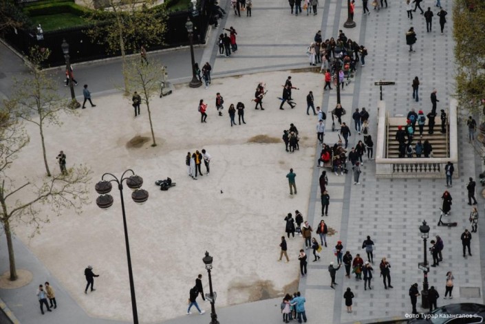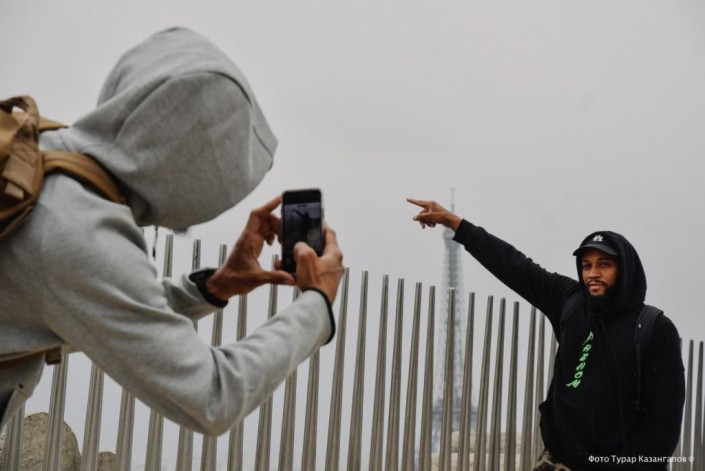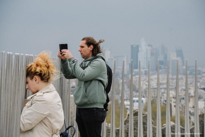 Кто-то может возразить, что в Казахстане на момент фото шел дождь. Не успели мы об этом подумать, как появился порывистый ветер и в столице Франции заморосило. Но люди не спешили расходиться со смотровой площадки.