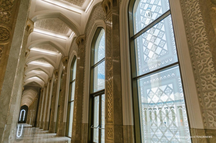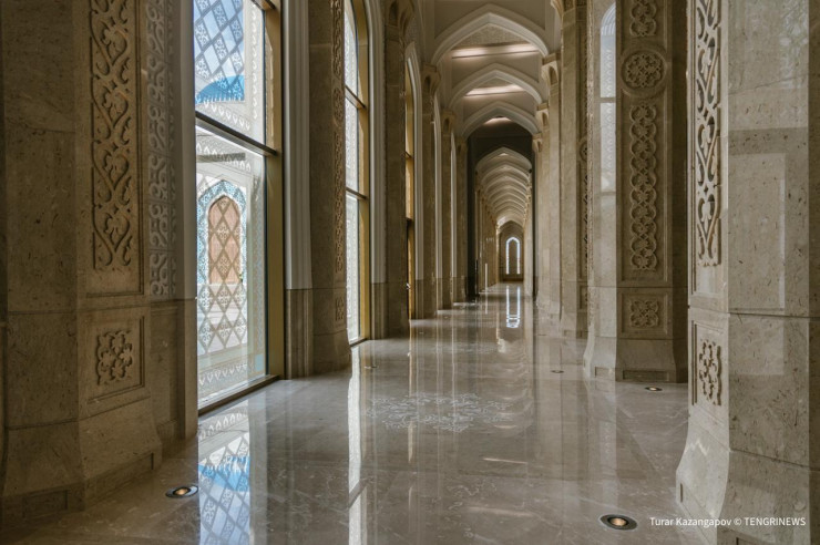 Большой зал и женская молитвенная зона полностью покрыты коврами с казахским орнаментом. Общая площадь коврового покрытия составляет 15 525 квадратных метров - это самый большой ковер ручной работы в мире. Толщина ковра - 15 миллиметров. Он был соткан в Новой Зеландии из 100-процентной шерсти.