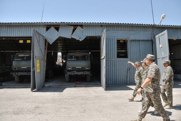 Министр обороны Нурлан Ермекбаев провел обход территории, проверил работу саперов и отправился в в административную половину воинской части.