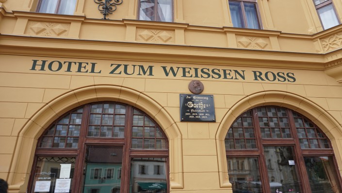 Писатель останавливался в отеле "Белый конь". Сейчас большая часть этого отеля принадлежит семье, которая владеет исторической пивоварней. Они выкупили отель и решили сделать его под времена Гете. Чтобы даже номера были похожи.