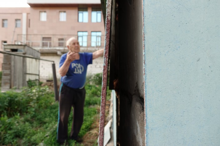 Павлов показывает нам трещины и разрушения, которые, как считает он, произошли в результате застройки вокруг его дома.