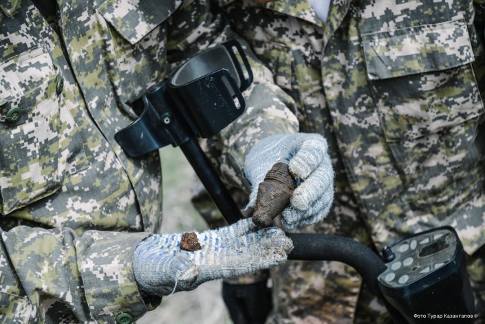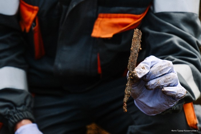 "Прошлись металлоискателем - вроде что-то зазвенело, копнули чуть - нашли краешек каски", - рассказывает молодой поисковик Руслан Нурпеисов.