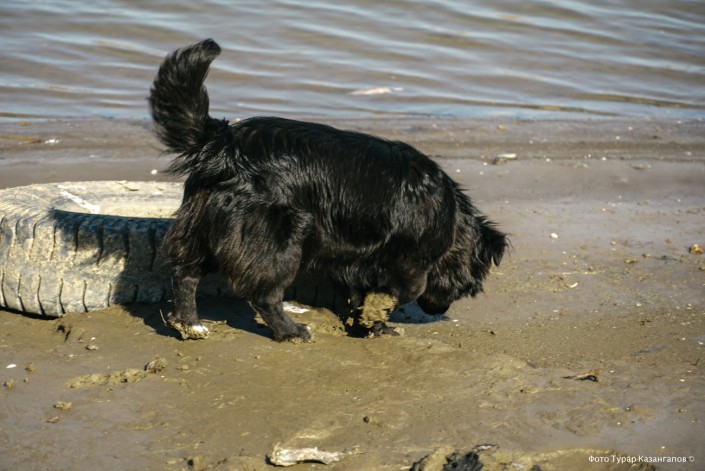 Собака на берегу Урала продолжала носить в пасти рыбу. Съедала ее и бежала опять к реке.