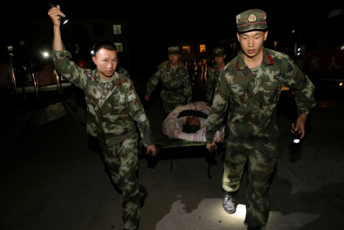 Военнослужащие из военизированных формирований Китая выносят пострадавшего после землетрясения.