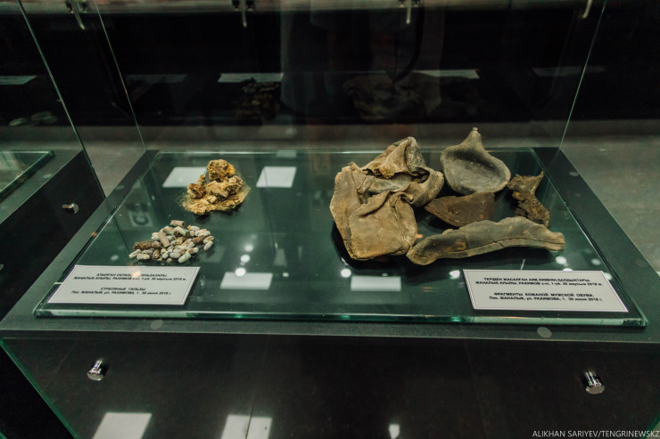 Ал бұл репрессия құрбандарының заттары. Бәрі 80-жылдары үй салу кезінде табылған. Сол жағындағысы атылған оқ гильзалары. Ал оң жағында теріден жасалған аяқ киім қалдықтары.