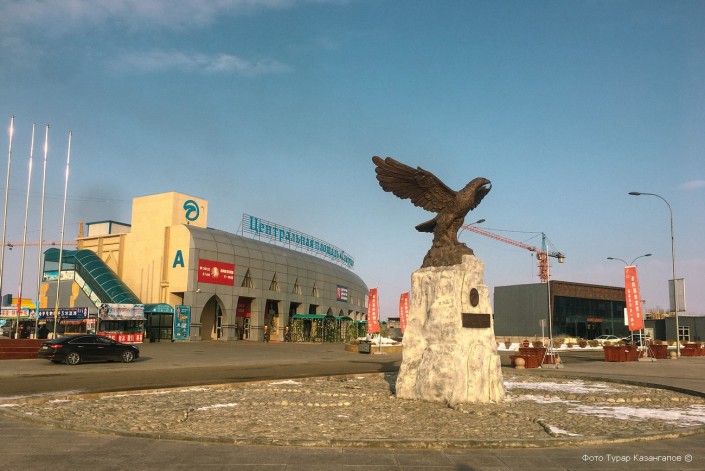 На казахстанской стороне есть центральная площадь. Она называется "Самрук". Здесь же находится монумент с птицей.