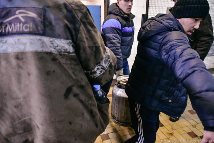 "Мы здесь все дни находимся. Смену свою отработаем и остаемся. Поддерживаем своих, тех, кто внизу. Сами видите, никаких провокаций нет у нас, все спокойно. Еду покупаем, теплую одежду, обувь и отправляем вниз. Знаете, там на глубине 477 метров не столько еда нужна, а тепло, так как там сыро очень и холодно", - рассказал нам Дархан.