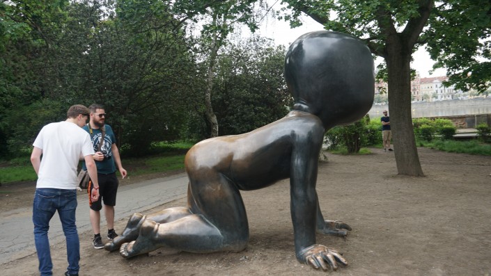 Малыши со штрих-кодами вместо лиц выражают протест скульптора против абортов. Первоначально такие младенцы появились на Жижковской телебашне Праги.