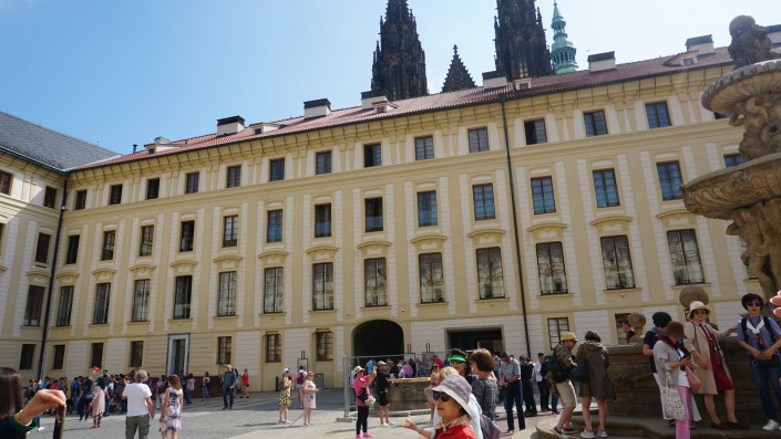 Мы, имея в запасе всего несколько часов, сразу же направились к Пражскому граду, самому большому дворцовому комплексу, занесенному в Книгу рекордов Гиннесса. В нем и сейчас расположена резиденция президента. Каждый час у входа можно увидеть торжественную смену караула. Почетный караул стоит в маленьких будках по две стороны от входа.