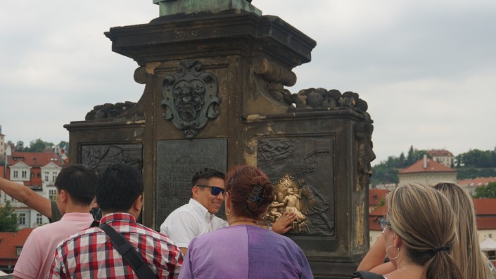 Люди то и дело потирают какую-нибудь фигурку и загадывают желание. Как объясняют гиды, на мосту есть лишь одно место, на котором можно загадать любое нематериальное желание. Это место, откуда сбросили в реку тело святого мученика Яна Непомуцкого в конце XIV века.
