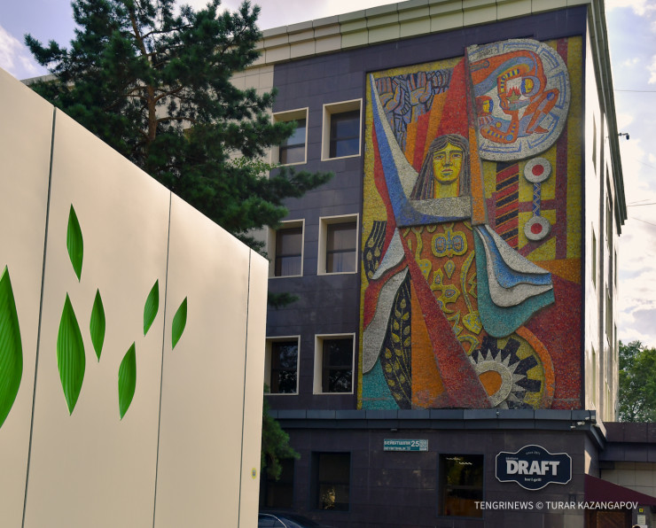 Переносимся к бизнес-центру "Оркен". По обе стороны от входа в здание есть две мозаики с рельефом. Это единственные в Казахстане мозаики, включенные в список памятников местного значения. При том, что само здание в этот список не входит.