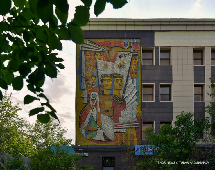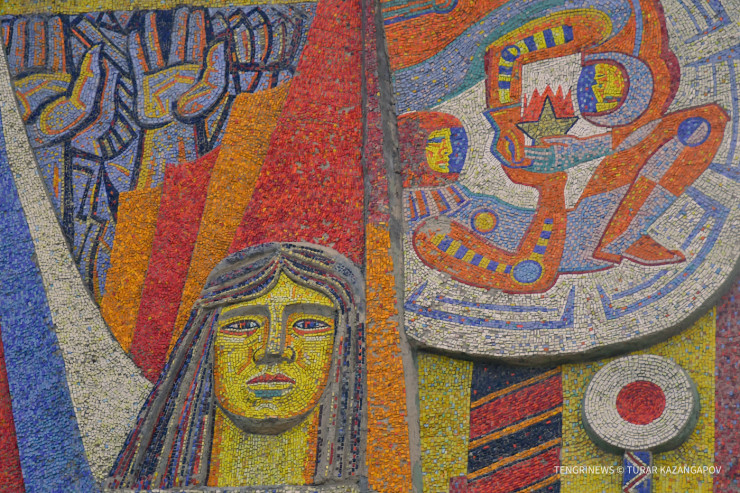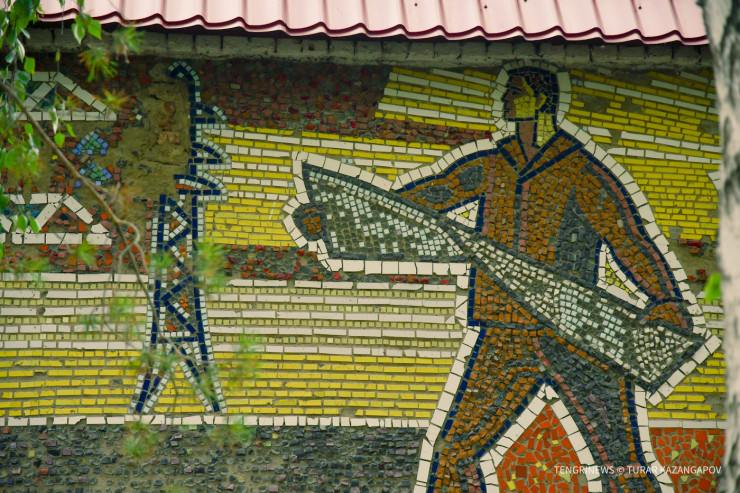 "Та, что справа, называется "Космос". Здесь изображены мать Земля, невесомость, космонавты в скафандрах и так далее. Само здание было облицовано, однако мозаику удалось сохранить", - рассказывает об идее работы Темиртас.