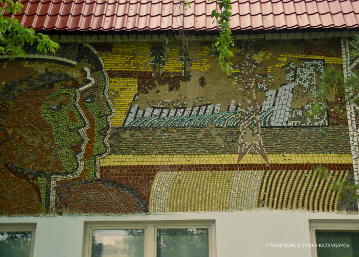 "Эта мозаика называется "Печать". Здесь очень интересный момент: на ней были указаны названия советских газет, однако в наши дни их закрасили. Изображены на ней девушка и парень на фоне книги, как олицетворение печати, издательского дела. В этом здании отпечатывались городские и региональные газеты. На ней также можно увидеть изображения лиц деятелей культуры и просвещения, так или иначе связанных с Казахстаном. Например, Абай Кунанбаев, Сакен Сейфулин, Тарас Шевченко. Кто изображен еще, мнения расходятся. Я разговаривал с сыном одного из авторов мозаики, он говорит, что одна из изображенных девушек справа - это царица Томирис", - делится исследователь.