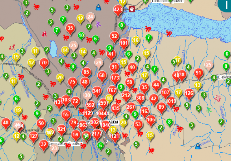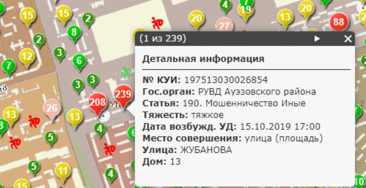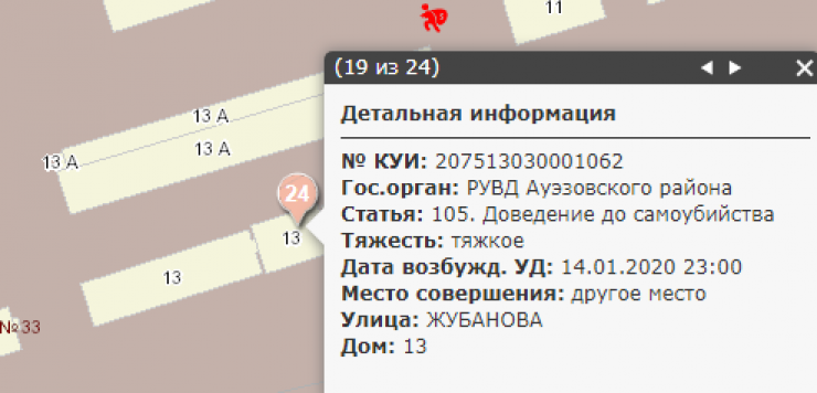 На карте видно, что по всему Алматы зафиксированы пиковые показатели преступности. Но если изучить подробнее, то можно заметить, что в доме № 13 по улице Жубанова криминальные сводки мелькают чаще других.