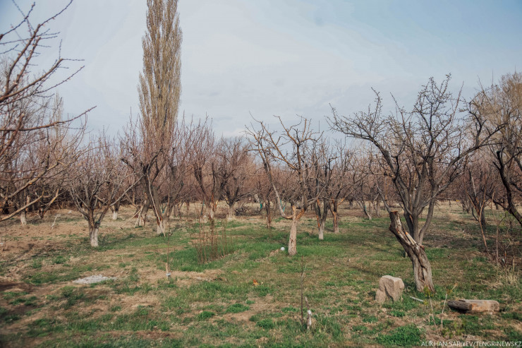 "У нас абрикосы (15 сортов), груши (талгарка, дюшес, Частухина), сливы (все сорта), яблони. Брат Мухаммед - он тоже известный беркутчи - помимо птиц, интересуется еще и садоводством, он может привезти веточку из Кыргызстана или Узбекистана. Туристы, когда приходят, удивляются, говорят: в таком маленьком поселке и увидеть такое!"