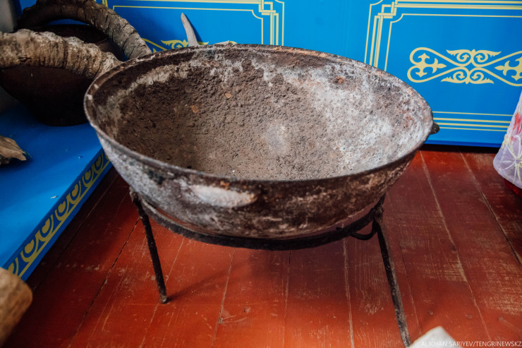 Отдельный уголок у нас для древней посуды, которая использовалась для мяса, кумыса, взбивания масла. А этот казан мы сами нашли в пещере.