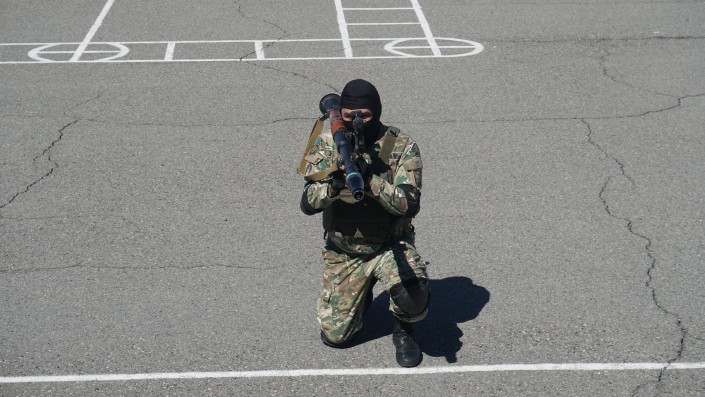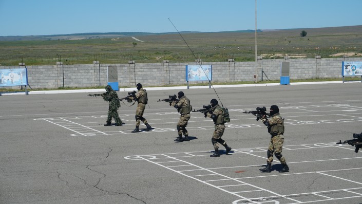 Группа специального назначения продемонстрировала приемы рукопашного боя для защиты от нападения. Тактические действия группой бойцов применяются при штурмах в городских условиях или в населенном пункте.