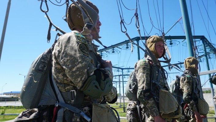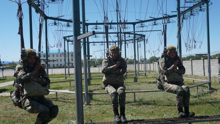 "Они должны четко знать, как разойтись друг с другом в воздухе, чтобы не врезаться друг в друга, чтобы не было столкновения между собой. Если в комплексе тренироваться, здесь ничего сложного нет", - отмечает офицер воздушно-десантной службы капитан Мади Ахметов.