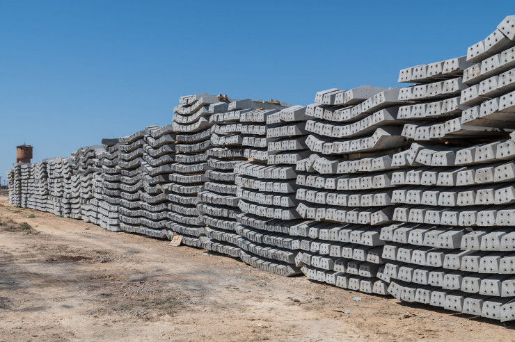 На временной звеносборочной базе ждут своего часа железобетонные шпалы и рельсовые скрепления, которые производятся у нас, в Казахстане.