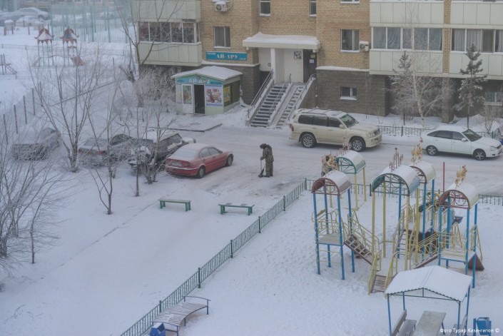 Ранее утро. Один из заснеженных, а лучше сказать замороженных дворов столицы. На улице все еще стоят сильные холода за минус 30. Жильцы уехали на работу. На свою службу заступил и местный дворник.