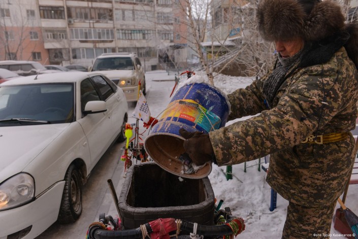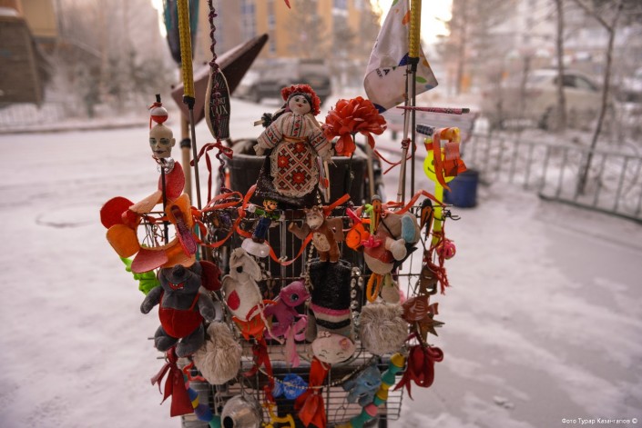 "Бывает, дети проходят и говорят: "Мама, вон моя кукла! Вон, у дядюшки Сэма!" - рассказывает нам дворник, кивая на свою тачку-коляску, увешанную игрушками и разной мелочью. "Вот так, работая на улице, я нахожу что-то, привязываю этот предмет себе на коляску, а потом, если появляется хозяин, возвращаю владельцу". Мужчина представляется всем дядей Сэмом. На самом деле у него есть настоящее имя, но он говорит, что уже отвык от него. На рабочем месте, во дворе одного из микрорайонов Астаны, у дяди Сэма есть каморка. Эта комнатка изначально предназначалась для мусоросборника. Но мусоропровод давно не используют по назначению, и благодаря находчивости и фантазии дядюшки Сэма помещение превратилось в уютную подсобку, где можно отдохнуть и согреться горячим чаем. Корреспонденты Ренат Ташкинбаев и Турар Казангапов провели день с этим человеком, который оказался в одном лице певцом, дизайнером, философом и просто очень творческой личностью.
