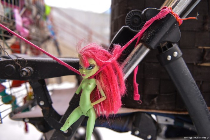 "А с чего началось все? Сперва я работал в другом дворе, и там была большая детская площадка. Бывает, забывает кто-то игрушку, выкидывать жалко, все-таки детское, стал на проволоку эти вещи привязывать к коляске. Вот так и пошло, и поехало. Кто потом находит свое у меня что-то - отдаю", - говорит дядя Сэм.