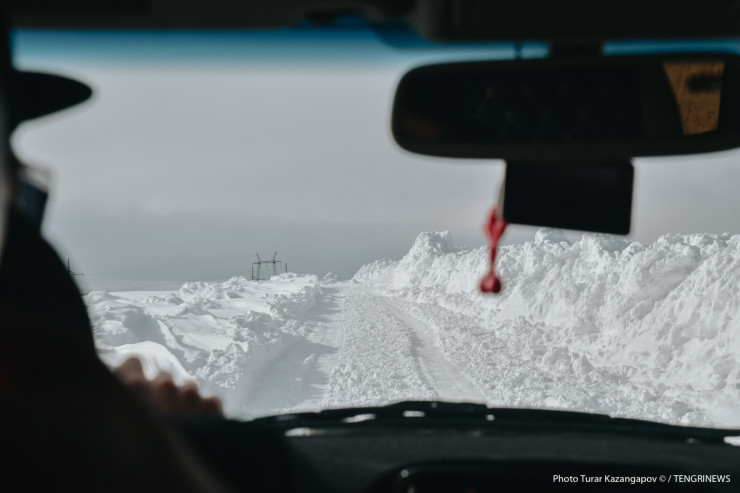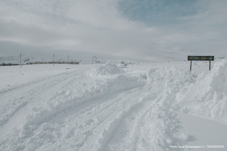 Эти кадры мы снимали в последних числах марта, и когда в соседних селах уже все начинало таять, здесь, в сопках, где расположен Верхние Кайракты, все еще была снежная зима. К этажному микрорайону мы так и не смогли подобраться поближе из-за сугробов, дороги туда не было, зато была захудалая дорога к частному сектору.
