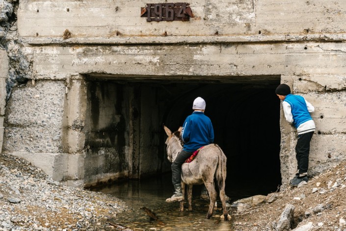 В сопровождении сельской ребятни и, конечно, уже знакомого нам мальчугана на ослике Бахыт показывает нам вход в одну из заброшенных шахт.