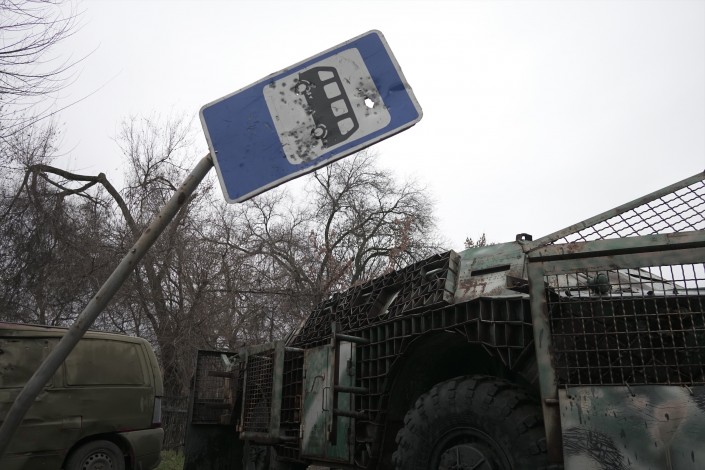 Посреди останков военной техники и простреленных указателей населенных пунктов гуляет женщина с ребенком.