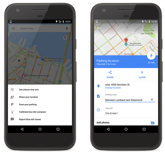 Узнать точную локацию, где была оставлена машина, можно уже сейчас в приложениях для Android и iOS. Владельцы Android-устройств могут просто нажать на кнопку "Сохранить мою парковку" (Save Your Parking) возле синей точки. При желании также можно будет сделать фотографию парковочного места, прикрепить заметку или напоминание.