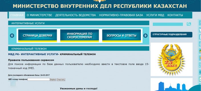 В апреле 2016 года на сайте Комитета по правовой  статистике и специальным учетам Генеральной прокуратуры РК сообщалось, что в Казахстане в случае хищения мобильного телефона работа устройства будет блокирована по IMEI-коду. Меморандум о взаимодействии территориальных подразделений МВД и операторов сотовой связи по блокированию ворованных мобильных телефонов был подписан в апреле этого года.