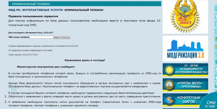 • если в течение месяца ваш телефон не обнаружится, то при наличии заявления в полицию вы можете проверить наличие сведений о IMEI-коде похищенного у вас телефона на сайте МВД РК. Таким образом вы удостоверитесь, разыскивается ли ваш телефон.