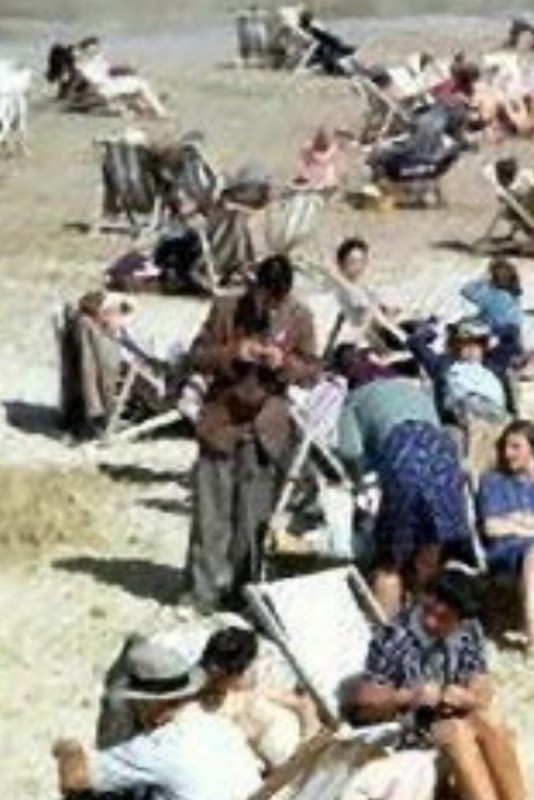 На снимке запечатлены британские рабочие, отдыхающие на пляже в Корнуолле. В центре можно заметить высокого человека, который держит в руках неизвестный предмет и внимательно в него вглядывается.