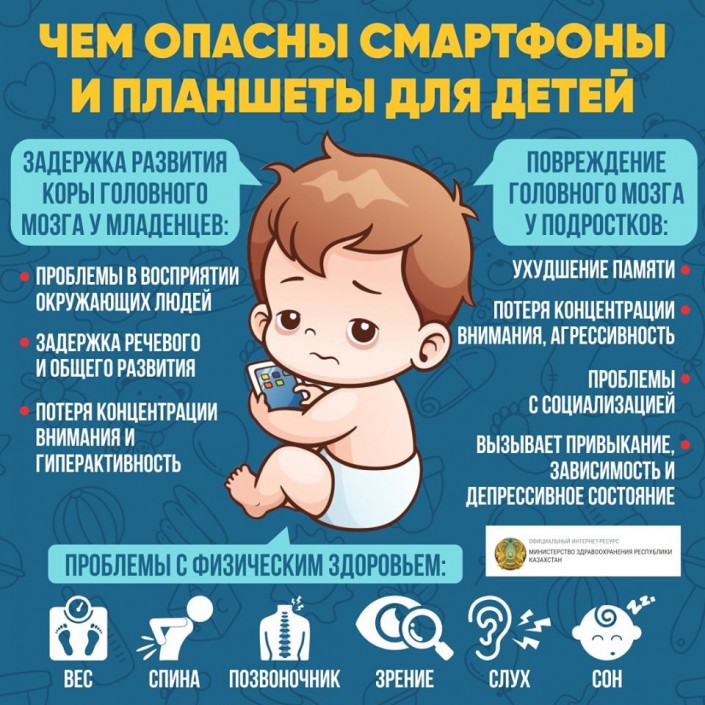 Сообщается, что использование детьми смартфонов и планшетов может стать причиной серьезных проблем со здоровьем. В частности, возможна задержка развития коры головного мозга у младенцев. А именно: возникнут проблемы в восприятии окружающих людей, может появиться задержка речевого и общего развития, ребенок станет терять концентрацию внимания и будет гиперактивным.