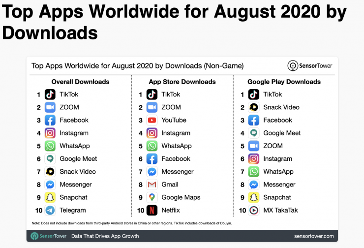 TikTok стал наиболее загружаемым мобильным приложением по итогам августа 2020 года, передает Tengrinews.kz. Об этом пишет Sensor Tower.