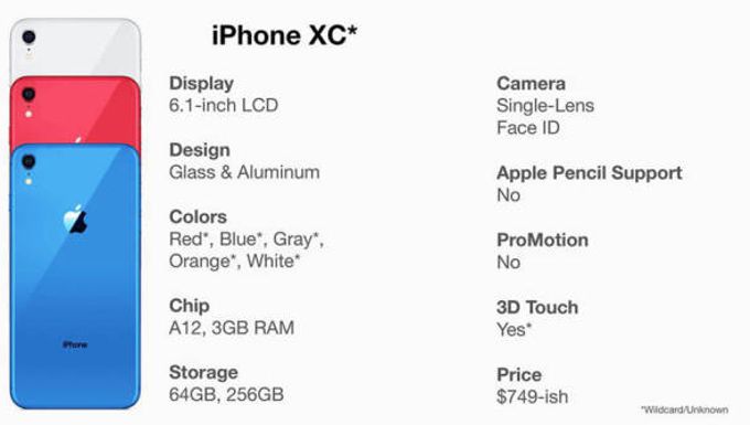 В бюджетном iPhone XС будет установлена одна камера и 6,1-дюймовый LCD-дисплей. Скорее всего, он получит тот же дизайн, что и флагманские модели, но рамки корпуса будут из алюминия. На последних фотографиях с возможными ценами iPhone XС представлен в пяти цветах (красном, голубом, оранжевом, сером и белом), а инсайдеры предсказывали шесть.