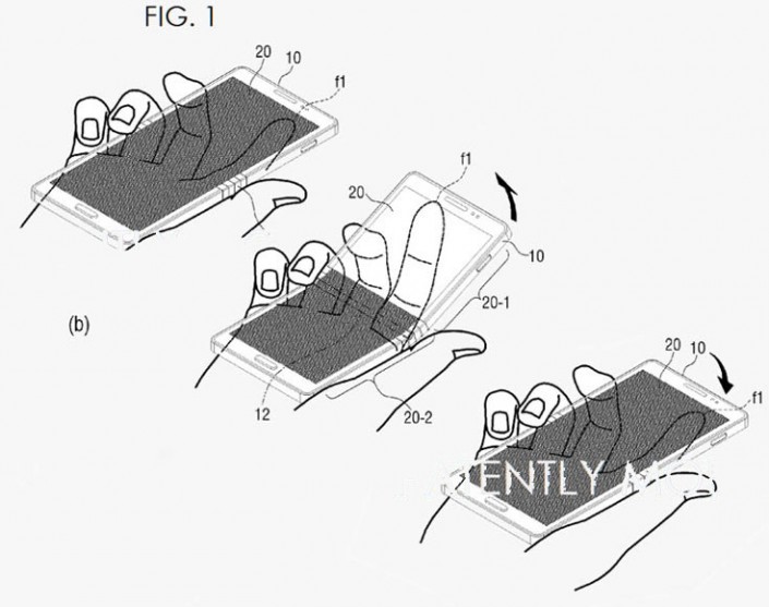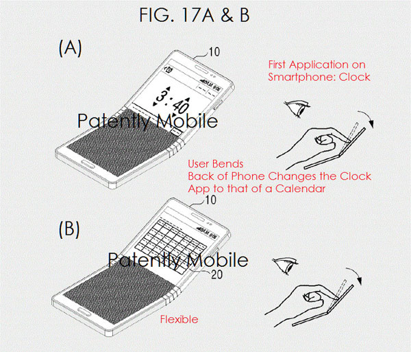 Другой патент описывает взаимодействие между пользователем и смартфоном, опирающееся на возможности гибкого дисплея. Например, гаджет, распознавая команды в виде сгибания и разгибания, может менять информацию, выводимую на дисплей, переключаясь между запущенными приложениями. Дополняя сгибания и разгибания другими действиями, например, наклонами или поворотами, можно активировать другие функции.