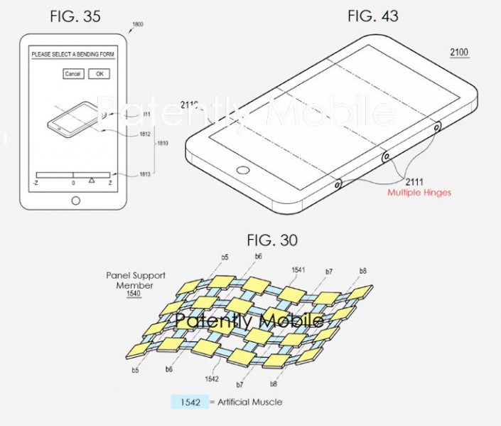 Судя по свежим патентам Samsung, в Сеуле продумали возможности реализации технологии и стараются в полной мере освоить ее потенциал. В первом документе компании описана конструкция, включающая, наряду с гибким экраном, двухмерную матрицу элементов, соединенных "искусственными мышцами". Устройство разделено на секции, соединенные при помощи петель. Электронные компоненты могут быть распределены между секциями.