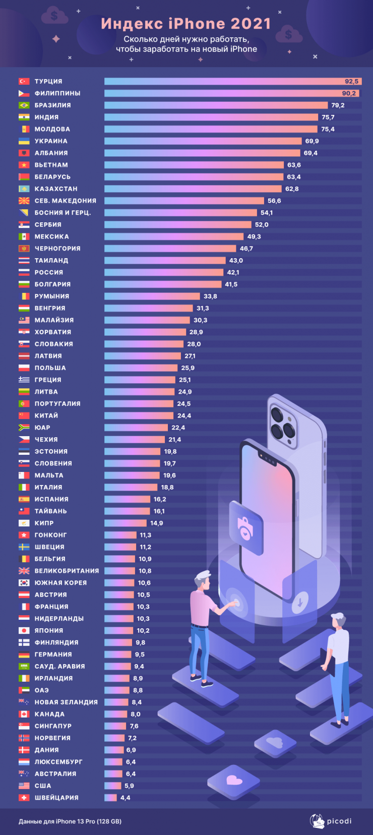 Среди стран, в которых новинка уже в продаже, худшие результаты у Турции, там для покупки iPhone 13 Pro 128 ГБ жителям придется отработать 92,5 дня. Второе и третье места с конца занимают Филиппины и Бразилия - 90,2 и 79,2 дня соответственно.
