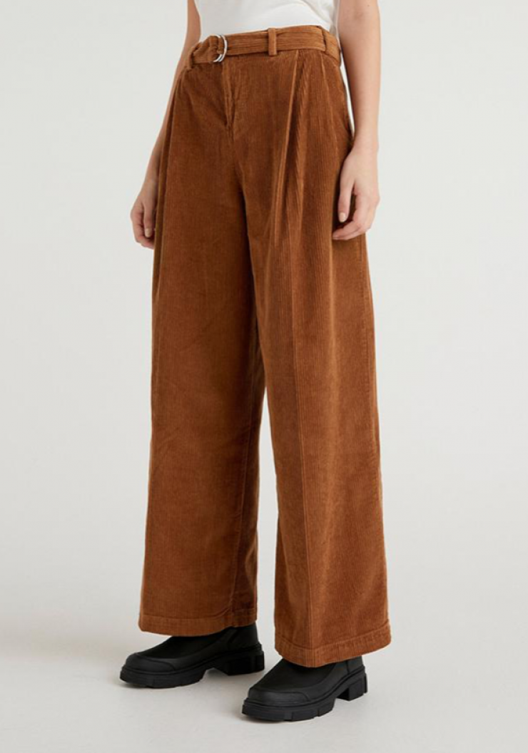 У итальянского бренда Benetton можно найти отличные варианты широких брюк. Подобные модели были замечены на показах сезона весна/лето-2023 у Vetements, Fendi, Burberry, Peter Do, Wooyoungmi и других. Вельвет придает таким брюкам расслабленность и вайб 70-х.