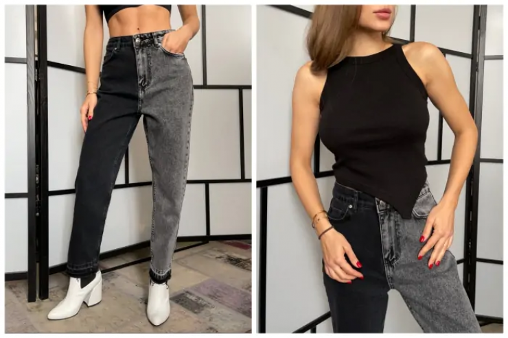 Цвет-блок может быть красивым и стильным. Для этого выбирайте джинсы с контрастными штанинами: левая – голубая, правая – синяя, например. Комбинации цветов могут быть разными.