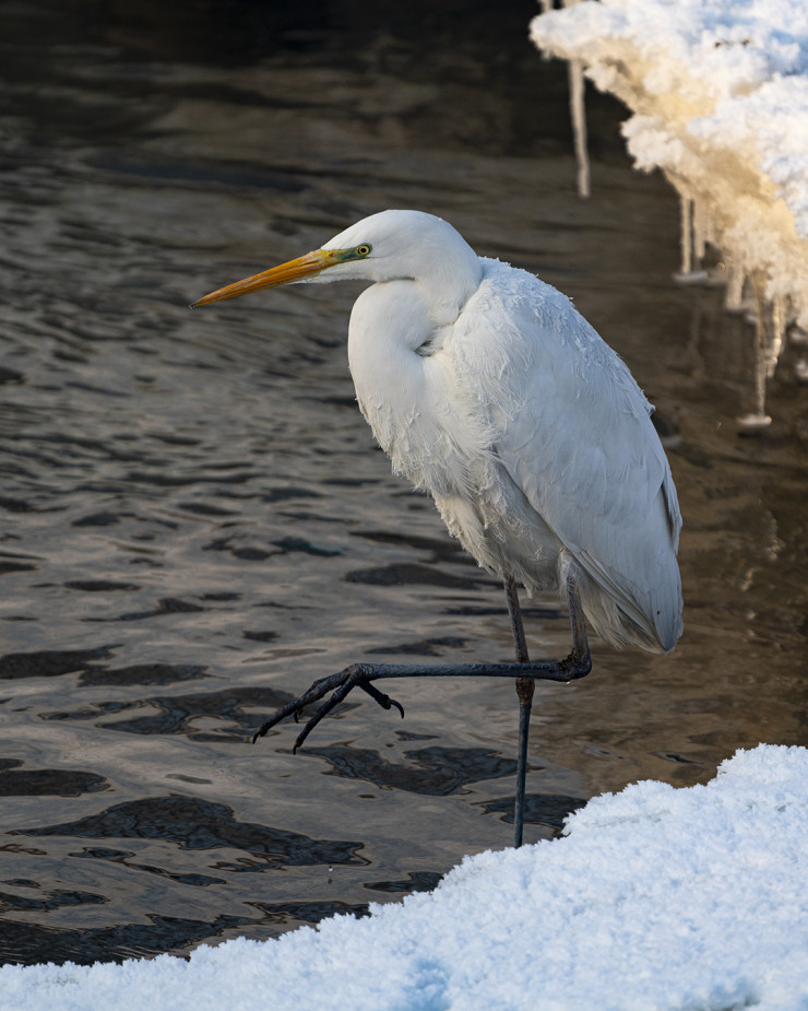 Пройдя озеро с севера на юг, фотографы не обнаружили цаплю и расстроились. Но в верхней части, где река Большая Алматинка впадает в Сайран, в полынье увидели грациозную птицу. По словам Дмитрия, она не просто стояла в воде, а охотилась за рыбой.