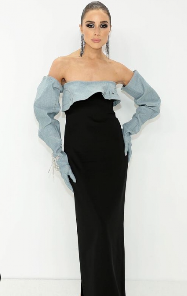 "Мисс Вселенная 2012" появилась в элегантном черном платье с ультра-длинными джинсовыми перчатками. Вставка из денима также обрамляла глубокое декольте наряда. Образ был дополнен драматичным макияжем глаз и крупными серьгами-люстрами.