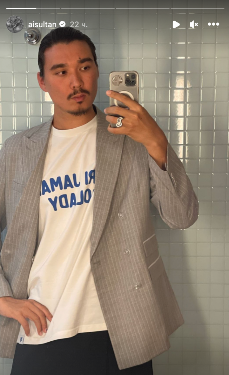 Образ Айсултана завершили белая футболка, серый пиджак в полоску, массивное кольцо на безымянном пальце и серебристые кроссовки Asics, напоминающие модель из 00-х.