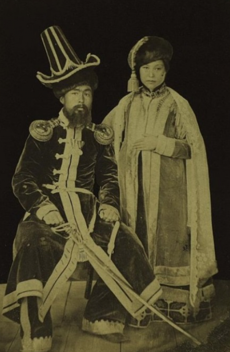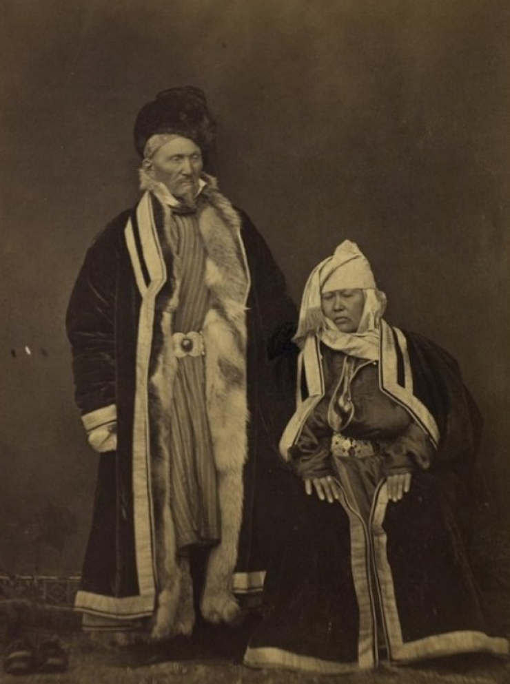 Групповой портрет мужчины и женщины в традиционных костюмах. Семипалатинская обл. 1879 год. Поляков И. С.
