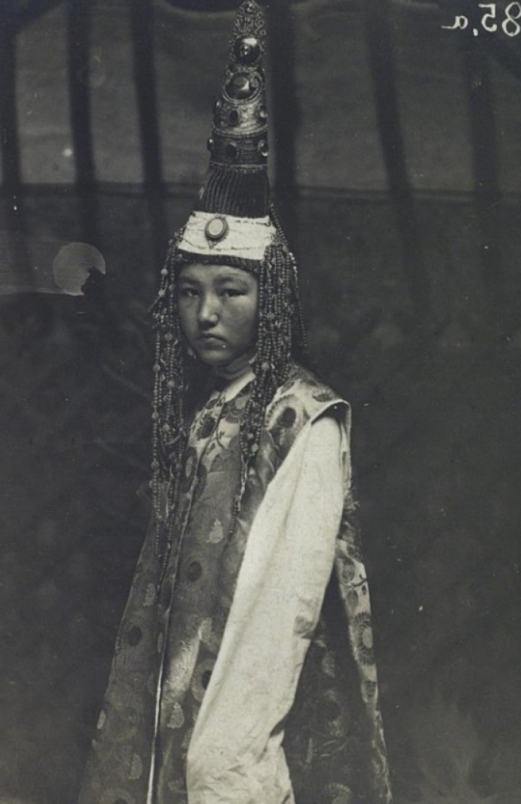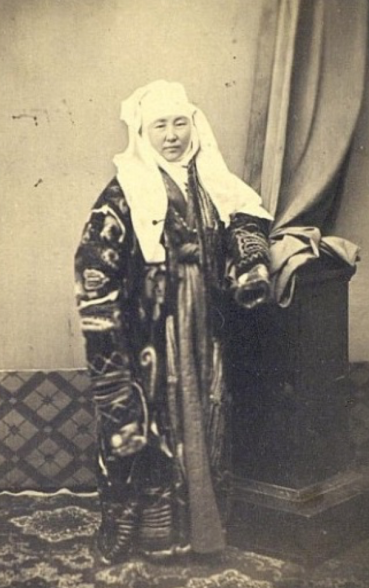 Дудин С. М. Девушка в свадебной верхней одежде и головном уборе саукеле (фас). Казахстан, Семипалатинская обл. 1899 год