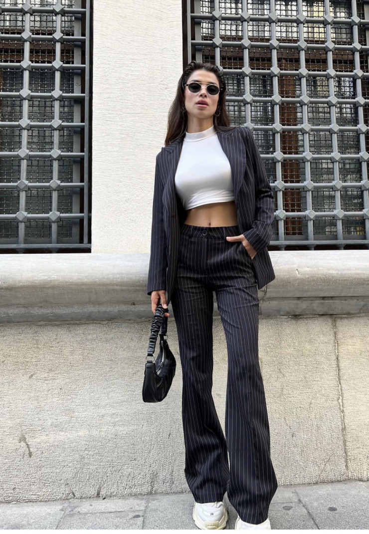 Можно носить укороченный верх или частично заправлять край одежды в брюки и юбки с высокой посадкой. Таким образом низ будет казаться длиннее, а верх меньше. Тем более что укороченные пиджаки или куртки - тренд сезона, поэтому можно сорвать двойной куш складным и модным образом, говорит стилист.