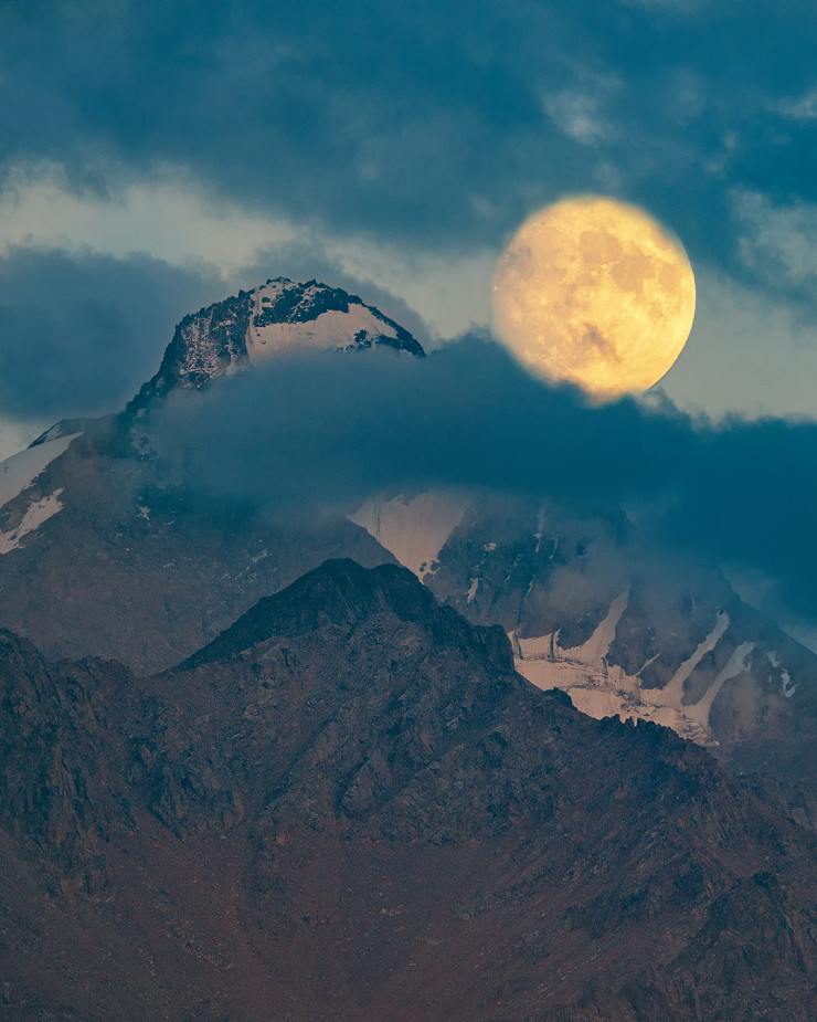 "Этот снимок сделал во время восхода луны над пиком Нурсултан. Тучи мешали, но в одном из просветов все же удалось поймать ночное светило", - сообщает Дмитрий.