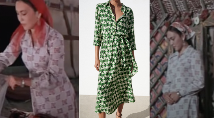 Предлагаем обратить внимание на платье Салтанат - она носит его на протяжении почти всего фильма. Девушка появляется в светлом платье с красным геометрическим узором и длинным рукавом. Такого же отыскать, к сожалению, нам не удалось. Однако в качестве альтернативы можно выбрать платье зеленого цвета с геометрией в качестве принта, которое также сейчас на пике популярности.