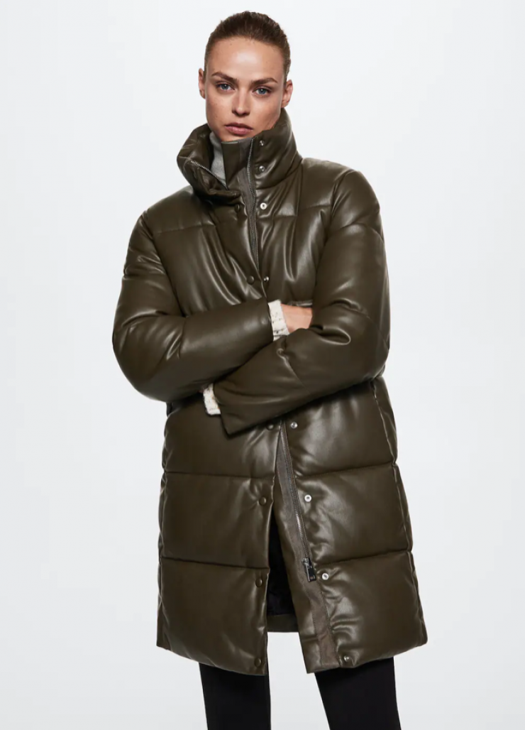 Этот вариант подходит для южной зимы, ведь пуховики из экокожи выдерживают морозы до -15 градусов. Трендовый оливковый цвет в темном оттенке придает пуховику несвойственную этому предмету гардероба элегантность.